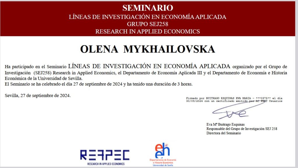 Участь у Семінарі “Líneas de investigación en Economía Aplicada” (Севільский університет, Іспанія)