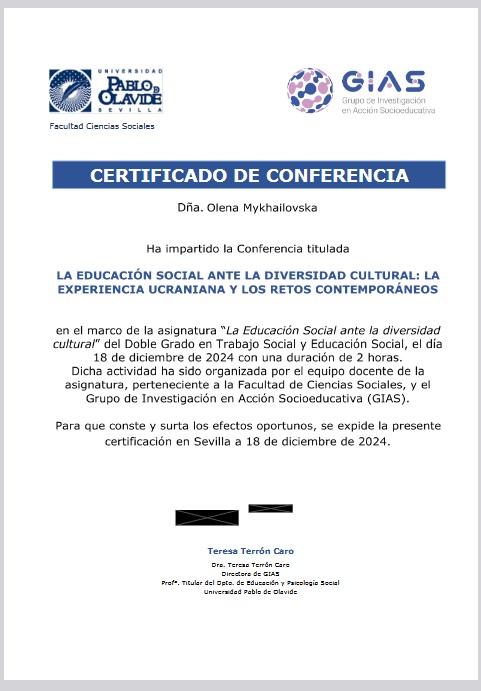 Олена Михайловська долучилася до конференційної активності факультету Соціальних наук Universidad Pablo de Olavide (UPO)