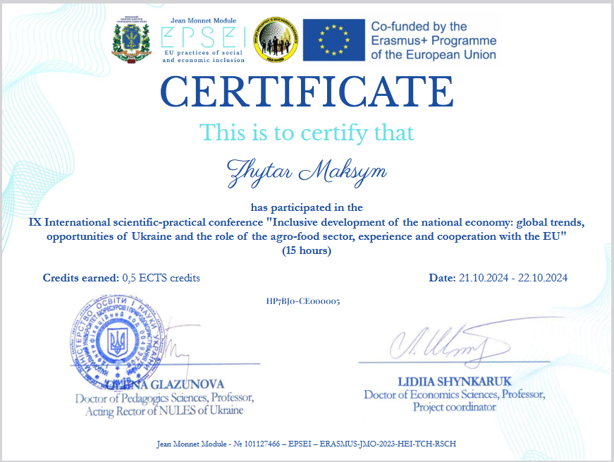 Участь у IX Міжнародній науково-практичній конференції «Інклюзивний розвиток національної економіки: глобальні тенденції, можливості України та роль агропродовольчого сектору, досвід і співпраця з ЄС»